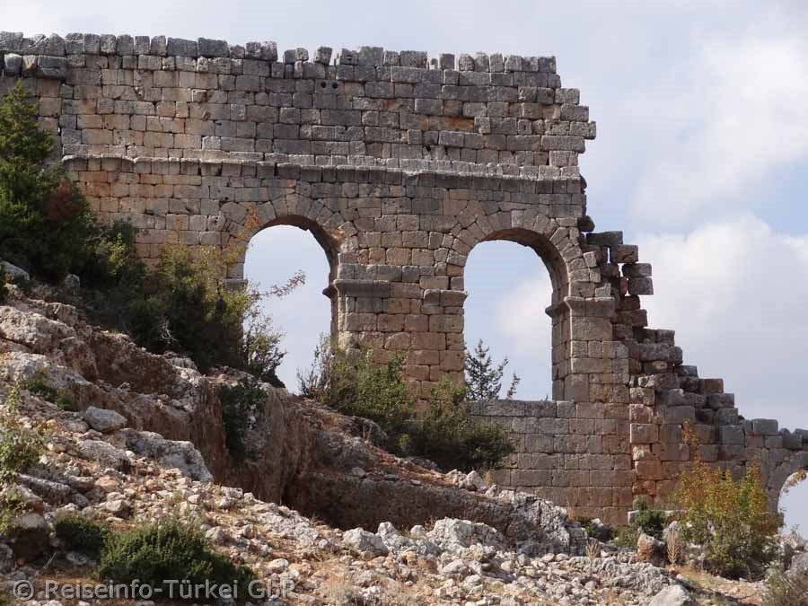Laut dem griechischen Geschichtsschreiber und Geographen Strabon (63 v. Chr. bis 23 n. Chr.) wurde die Gründung der Stadt auf Aias, einem Halbbruder des Teukros, König von Zypern, zurückgeführt. Aias begründete in Olba eine Priesterherrschaft und predigte den Kult des Zeus Olbios. Aus Inschriften ist bekannt, dass die Stadt Ende des 3. Jh. / Anfang des 2. Jh. von der Dynastie der Teukridai, allesamt Priesterkönige, regiert wurde. Deren Reich dehnte sich von Claudiopolis (Mut) bis nach Kanytelleis (Kanlıdivane) aus. Auch als das nahe Diokaisareia unter Marcus Antonius Stadt wurde, blieb Oba Sitz der Könige. 39 n. Chr. endete die Priesterdynastie, 72 n. Chr. wurde es in die römische Provinz Cilicia (Kilikien) einverleibt. In byzantinischer Zeit wird Olba der Provinz Isauria, später Pamphilien zugerechnet. Im 5. Jh. wird Olba als "Ort der Wunder der hl. Thekla" erwähnt. Die hellenistische Stadt lag auf dem Hügel und war von einer heute noch teilweise erhaltenen Stadtmauer umgeben. Die Akropolis wurde auf einem 1112 m hohen Hügel mit dreieckiger Grundfläche erbaut. Die Hänge und die Kuppe des Hügels sind mit antiken Bebauungsresten und Zisternen übersät. An der alten Kreuzung der Straßen nach Diokaisareia, Korykos und Seleukeia sind heute die Reste des Nymphäums zu sehen. Am besten erhalten ist der Aquädukt, einem Bauwerk einer 20 km lange Wasserleitung in die Stadt. Inschriften am Aquädukt besagen, dass der Aquädukt zur Zeit des Kaisers Septimius Severus (193 - 211 n. Chr.) errichtet und unter Kaiser Justuin II im Jahre 566 restauriert wurde. Der zweigeschossige Aquädukt ist 150 m lang und 25 m hoch.100 m ins Tal hinein befindet sich an der nördlichen Seite ein Felsengrab mit Tempelrelief. Im Felsen um die Grabkammer ist die Fassade eines Tempels mit Gebälk, Säulen und Altar im Relief abgebildet. Die heute noch erhaltenen Grundrisse zeigen, dass die antiken Häuser an den Nordhängen erbaut wurden. In einem Gebäude sind 6 Steinbecken mit einen Durchmesser von 60 cm erhalten, ein Zeichen dafür, dass hier Wein gekeltert oder Öl gepresst wurde. Eine separate Wasserleitung war durch einen verschließbaren Kanal in das Haus geführt worden. Im Umfeld der Stadt finden sich einige Felsnekropolen die sich jedoch vor allem im Norden und Süden konzentrieren. Die südliche Nekropole liegt ca. 250 m vom Nymphäum entfernt und enthält zahlreiche Felsengräber und Sarkophage aus römischer Zeit. |