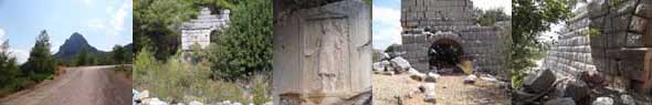 Aksu. Folgen Sie der Ausschilderung nach Kozan. Knapp 2 km nach dem letzten Abzweig (nach links) haben Sie das Dorf Kozan erreicht. 200 Meter nach der Moschee zweigt linker Hand ein Weg ab. Bis kurz hinter dem letzten Anwesen ist der Weg noch mit einem normalen PKW befahrbar. Das nun folgende, ca. 1,5 km lange Wegstück bergauf ist trotz evtl. gegenteiliger Aussage der Einheimischen nur noch mit einem Geländewagen sicher befahrbar. |