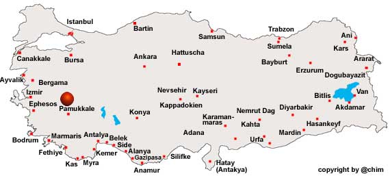 | Sardes liegt an der Nationalstraße D300 von Izmir Richtung Salihli. 10 km vor Salihli zweigt rechts die Straße nach Sart ab. Von hier sind es noch 900 Meter bis zum Parkplatz am Gymnasion. Der Weg ist braun ausgeschildert. | |||||
