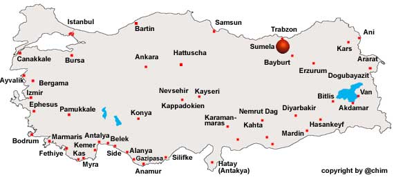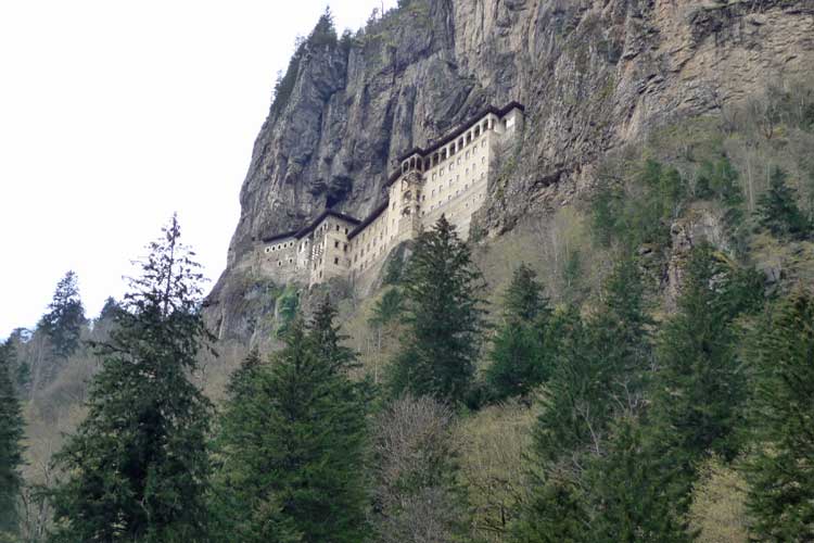 Das Kloster Sumela ist auch unter dem Namen "Marienkloster" bekannt und liegt 37 km südlich von Trabzon im Distrikt Maçka in einer alpenländlich anmutenden Umgebung. Es zählt zu den bedeutendsten heiligen Orte der orthodoxen Kirche in Anatolien. Die Gründung des Klosters im Jahre 385 n. Chr. ist auf zwei aus Athen kommende Mönche zurückzuführen. Sie sollen der Sage nach eine vom Evangelisten Lukas gemalte heilige Ikone der Heiligen Mutter Maria in der Felsenhöhle versteckt haben. Nach der Eroberung dieser Gegend im Jahre 1461 durch osmanische Truppen hielt das Kloster seinen Betrieb aufrecht und wurde weiterhin zu religiösen Zwecken genutzt. Im Osmanischen Reich war das Felsenkloster einer der wichtigsten orthodoxen Wallfahrtsorte. Seit dem Jahr 1972 ist es als Nationaldenkmal unter Schutz gestellt und für den Besuch geöffnet. Heute wird das Kloster hauptsächlich von orthodoxen Christen besucht. Leider sind die Fresken aus dem 14. Jahrhundert stark beschädigt. Das Kloster wurde 1922 verlassen und kurze Zeit später durch Feuer stark beschädigt. Religiöse Fanatiker und moderne Touristen trugen zur weiteren Zerstörung bei. 1972 wurde es von der türkischen Regierung als Nationalerbe unter Schutz gestellt wurde und steht seither Besuchern offen. In den letzten Jahren erfolgten umfangreiche Restaurierungsarbeiten. |