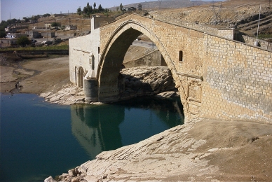 Neben der modernen Brücke über den Tigris nach Hasankeyf sind die Reste der antiken Brücke zu sehen. Sie wurde bereits 638 n. Chr. urkundlich erwähnt. Über den rechten Pfeiler im Fluss erkennt man die Reste der Zitadelle. Die in den Tuff gehauene Steiltreppe führt vom Flussufer hinauf zur Festung. |