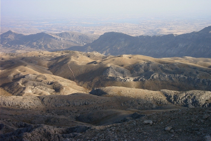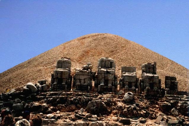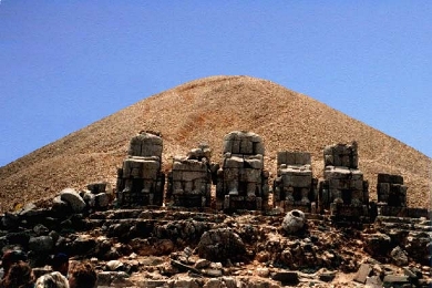 Der Gipfel des Nemrut besteht aus einem heute etwa 50 Meter hohem Kegel aus aufgeschüttetem Steinschotter. Unter diesem Schotter vermutet man das Grab des Antiochos I., König von Kommagene und das seines Vaters Mithradates I. |