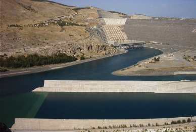 Der Damm des Atatürk-Stausees wurde 1992 fertig gestellt und ist der größte der Türkei und einer der größten in der Welt. Er wird bis zu 84 Milliarden Kubikmeter Wasser des Euphrat aufstauen und bildet einen künstlichen See von 817 qkm. |