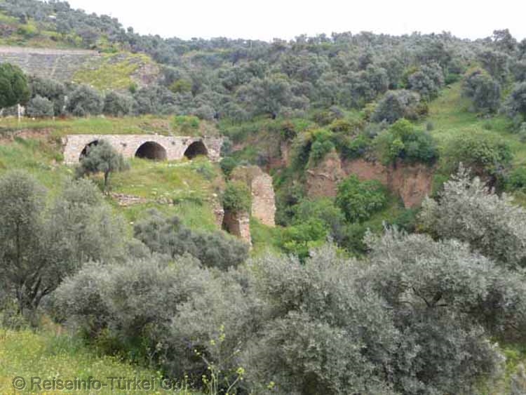 Hinter den Büschen die Reste des alten hellenistischen Theaters