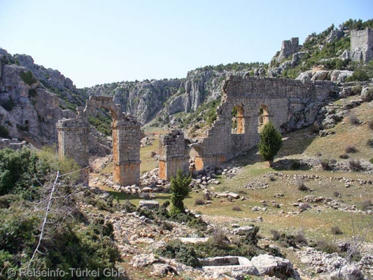 antiken Bauten, das Aquädukt und rechts die Akropolis