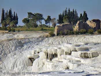Pamukkale, die Kalk-Sinterterrassen, befinden sich 19 km nördlich der Stadt Denizli. Bis Antalya sind es 240 km, bis Fethiye 185 km, bis Marmaris 180 km, bis Bodrum 240 km und bis Kuşadası 185 km.